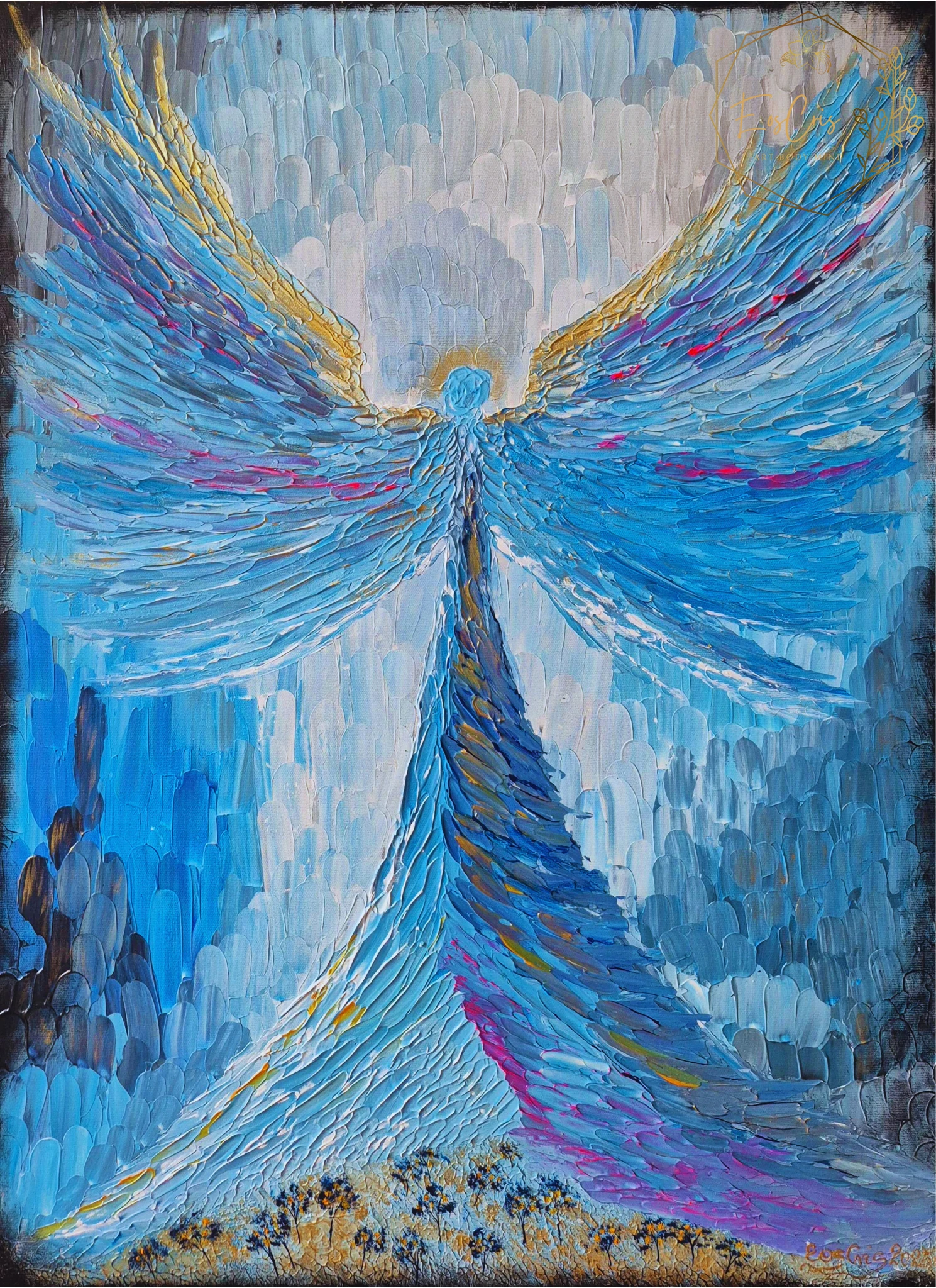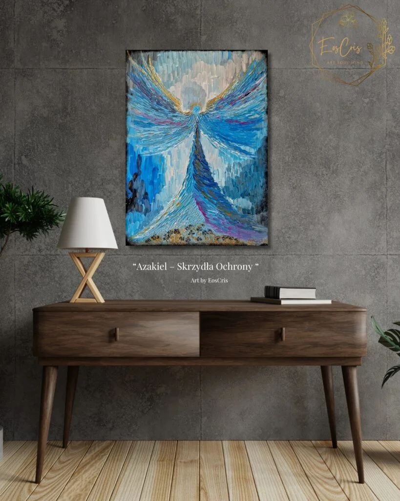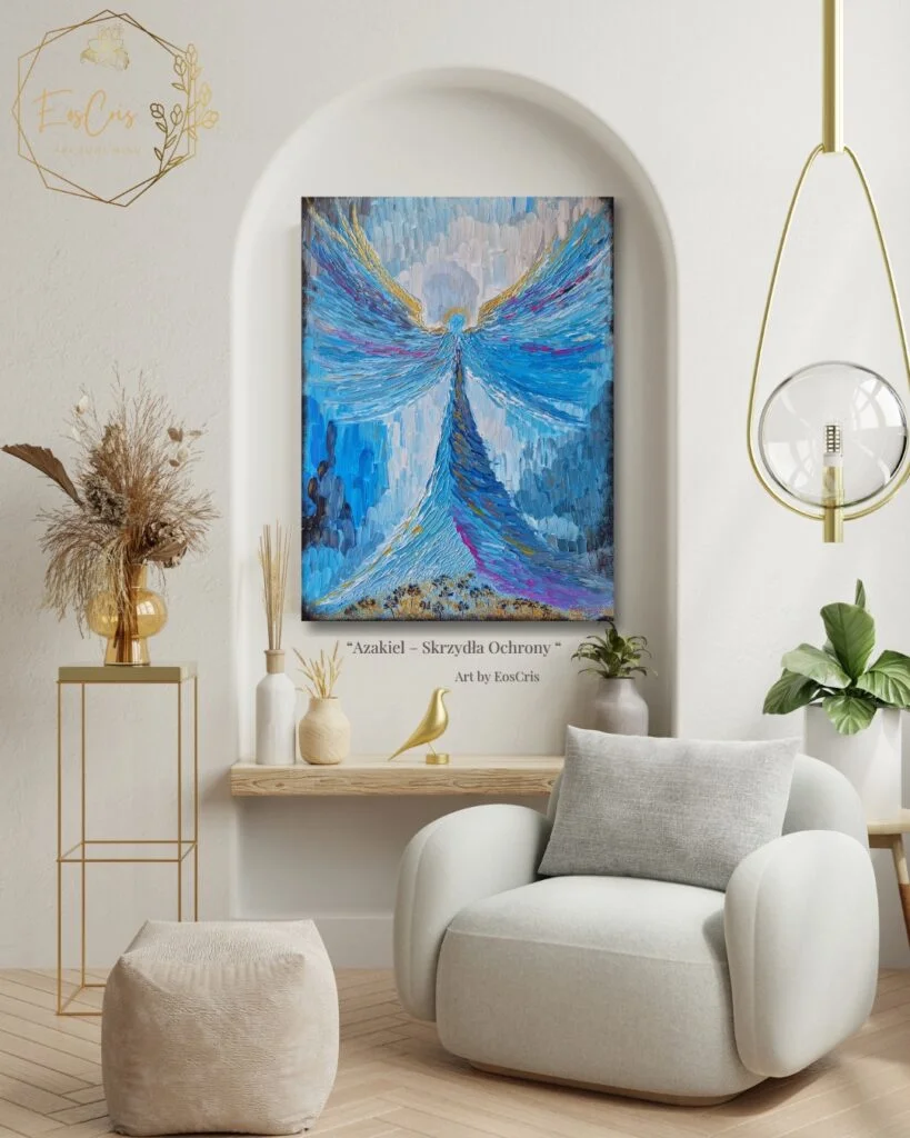 Obraz został wykonany niemal w całości szpachelką, w technice impasto – z warstwami struktury, które unoszą się nad płótnem jak fale ochronnej energii. Przebłyski złota i drobinki brokatu wprowadzają świetlistość i ślad obecności Azakiela. Każdy niebieski kolor, każda warstwa to zapis energii: zakodowana bariera ochronna, subtelny pancerz dla duszy, przestrzeń ciszy, w której można odnaleźć oddech i oparcie.