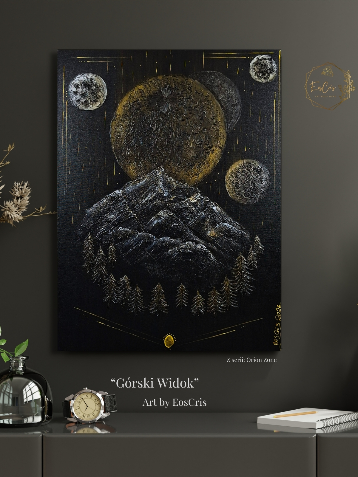 Obraz „Górski Widok” to kolejna brama do unikalnej energii Orion Zone, owoc mojego głębokiego połączenia z mądrością Istot z planety Berberdura. Tym razem otwieramy przestrzeń niezwykle intymną – portal do serca kosmicznej ciszy. Berberduranie aktywnie wspierali proces twórczy, nasycając to dzieło swoją unikalną wibracją. W tym obrazie czerń jest naczyniem wypełnionym czystym spokojem i obecnością Berberdury. Choć jego energia wydaje się nieruchoma, z tej właśnie ciszy wyłania się potężne, skumulowane wzmocnienie, pulsujące w każdym z ukazanych księżyców. Energetyczny obraz wspierający wolę działania, koncentrację i wewnętrzną dyscyplinę.