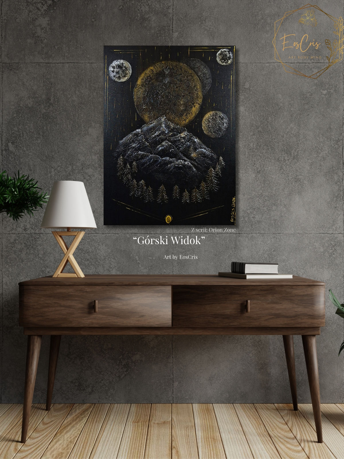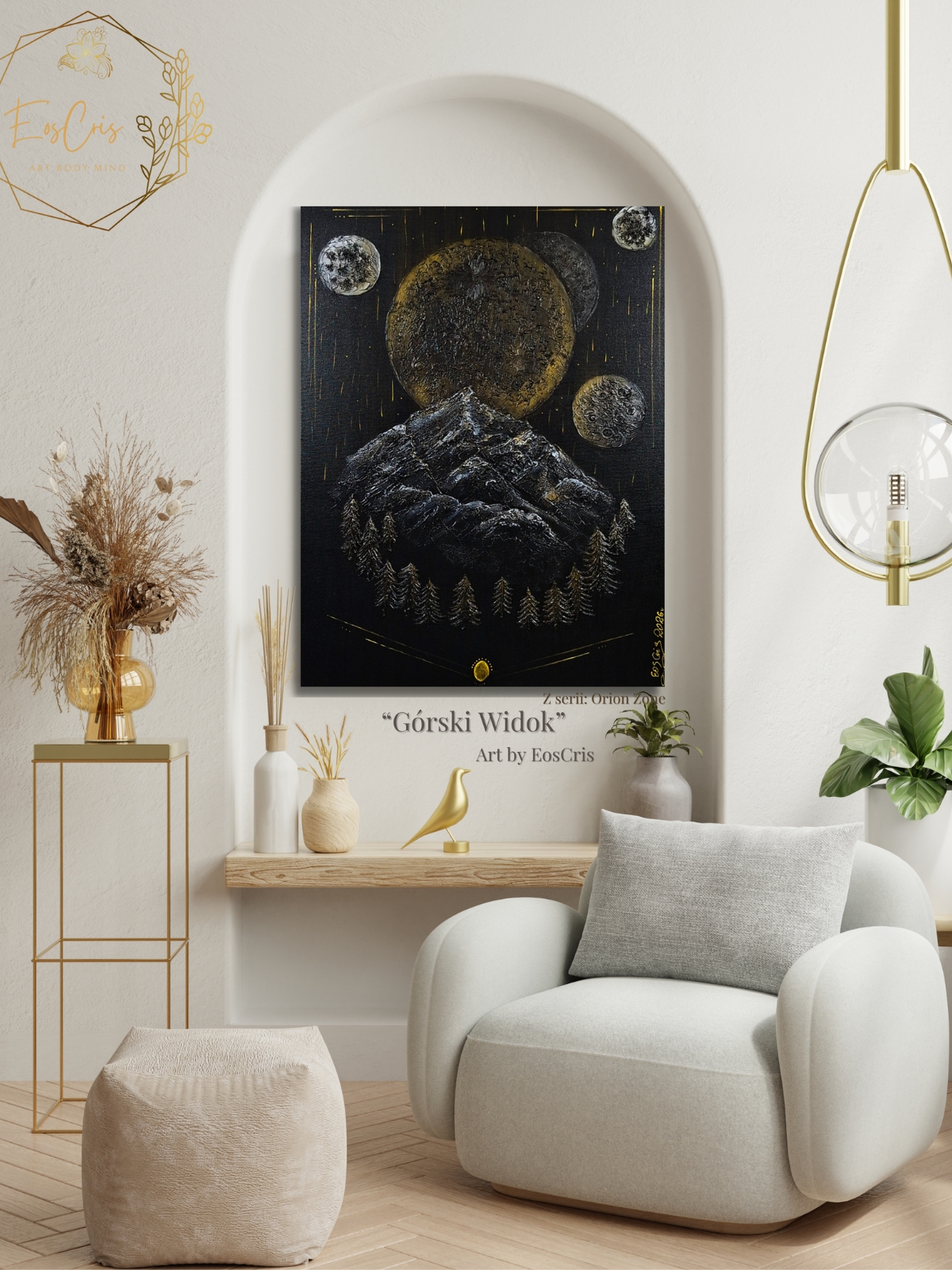 Struktura majestatycznego spokoju: Góry, wznoszące się dumnie w centralnej części, oraz strzelisty las u ich stóp, nie są tu barierą. To kotwice Twojej ziemskiej obecności, które w połączeniu z kosmiczną perspektywą, dają poczucie stabilności i pewności. Dotykając ich dynamicznej, bogatej faktury, łączysz się z niezłomnością Ziemi i nieskończonością Kosmosu. Wyzłocone pnie drzew subtelnie odbijają światło księżyców, łącząc te dwa światy.