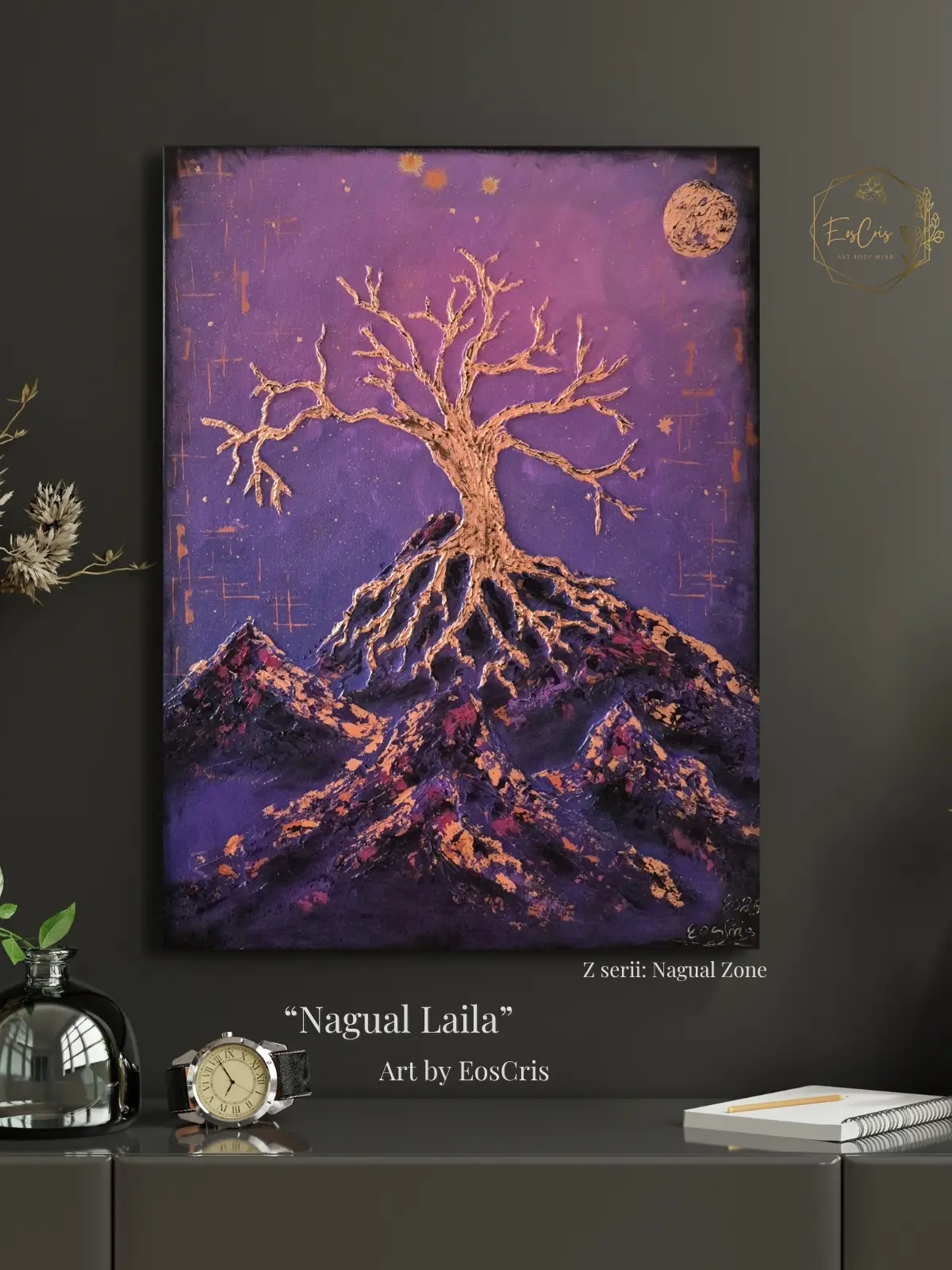 • Dla sensoryków i estetów: Harmonizujące barwy fioletu, purpury oraz blask metali tworzą luksusową całość, która pracuje poza słowem i myślą. Struktura obrazu zaprasza do bezpośredniego kontaktu, pozwalając energii „osiąść” w fizycznej rzeczywistości Twojego domu.